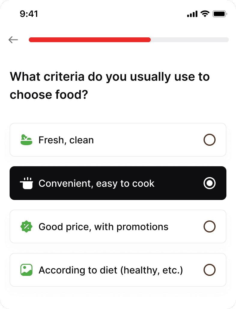 A quick survey to personalise dining needs and product suggestions from the very first use.